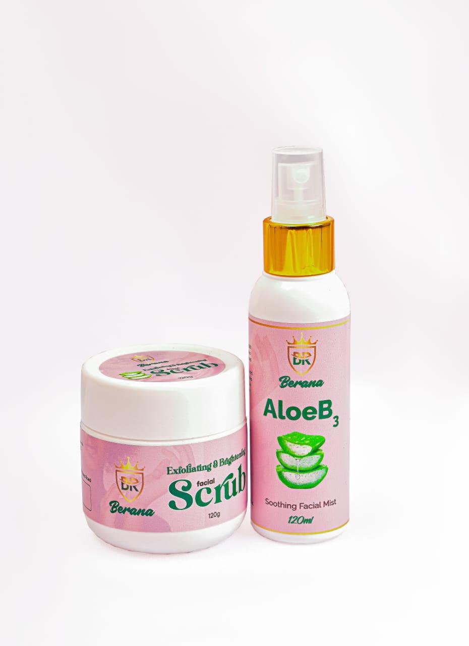 Berana AloeB3 facial toner and scrub are a beauty facial routine set that collectively gives a youthful bright skin. our scrub contains activated charcoal that carefully absorbs toxins from skin, it also has enzyme activity that slowly exfoliates dead skin cells. AloeB3 facial mist with hyaluronic acid, niacinamide, vitamin C and licorice reduces oxidative stress on skin, reduces pore sizes,reduces oiliness and shine, gradually fades pigments and dark spots,deeply conditions and moisturising while ensuring an even toned firm skin. Note: Both products can last a month in use.